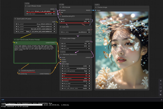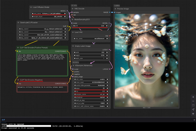 後半で触れたが入稿直後にComfyUIが HiDream-I1 にネイティブ対応したため、急遽Workflowをご紹介したが、今回改めてFull/Dev/Fast全てのWorkflowを掲載したい。Checkpoint/(Quad)CLIP/VAE Loader、ModelとKSamplerの間にModelSamplingSD3 Node (Shift) が入る簡単なWorkflowとなる(以下全ての作例はfp8を使用)。