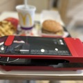 モバイルオーダーでビッグマックセットを頼み、レコードとサウンドバーガーとハンバーガーを席に設置。マックフライポテトとコーラをパクつきながらセットアップしました。テーブルは狭いのですが、サウンドバーガーを置いて再生することは可能。サウンドバーガーはLPサイズの3分の1以下の占有面積で、レコード部分は自分の方にはみ出させることができるので、比較的狭いスペースでも使えます。MacBookを席で広げるのとさほど変わらない気も。ただ、ポテトの塩がレコードの盤面に落ちがちなので注意が必要です。