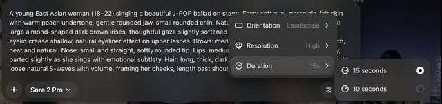 Sora 2 Proの標準解像度の方が、Sora 2よりも劣るわけです。15秒にする分、解像度は落ちてもいいという人のための選択肢ということでしょうか。