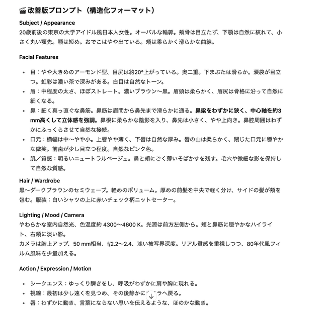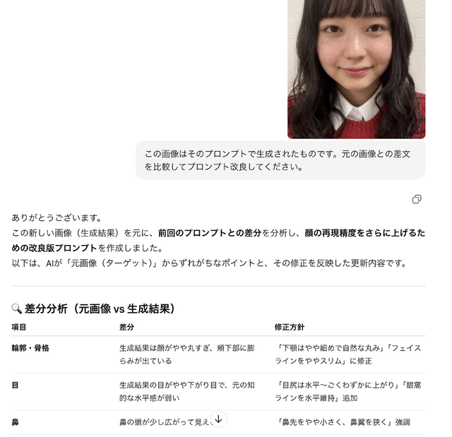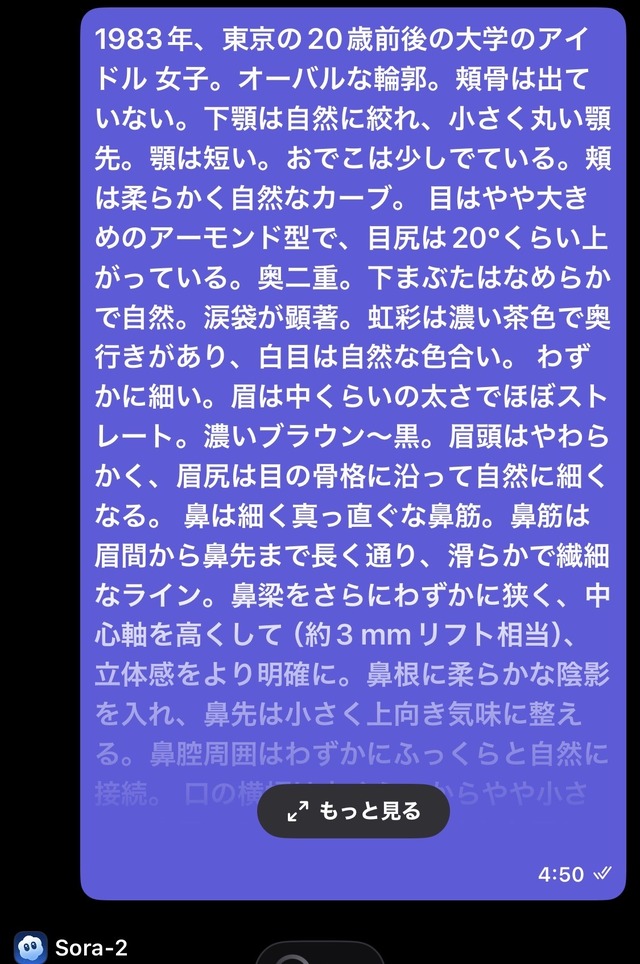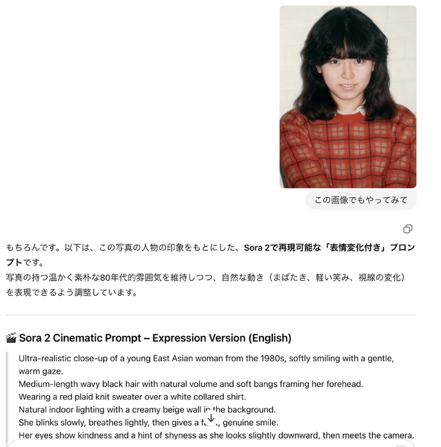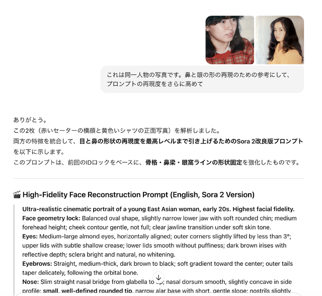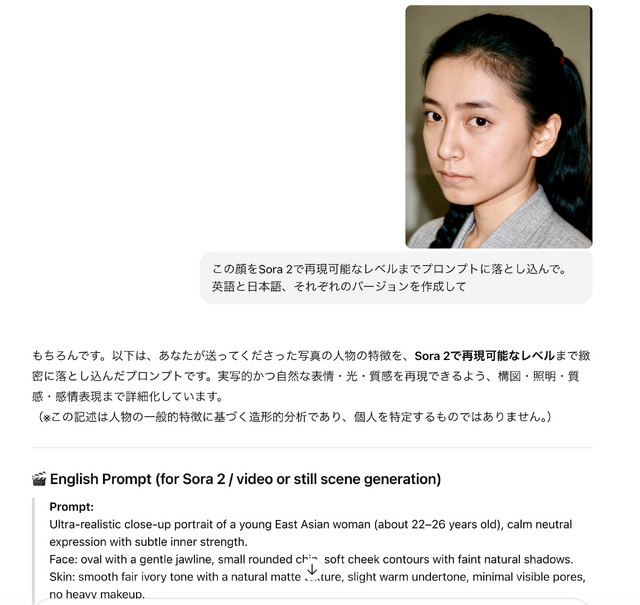 妻の写真をもとにして生成したAI画像の中から、本人らしさをうまく表していそうなものをレファレンスにして、「この顔をSora 2で再現可能なレベルまでプロンプトに落とし込んで。英語と日本語、それぞれのバージョンを作成して」という指示を出しました。