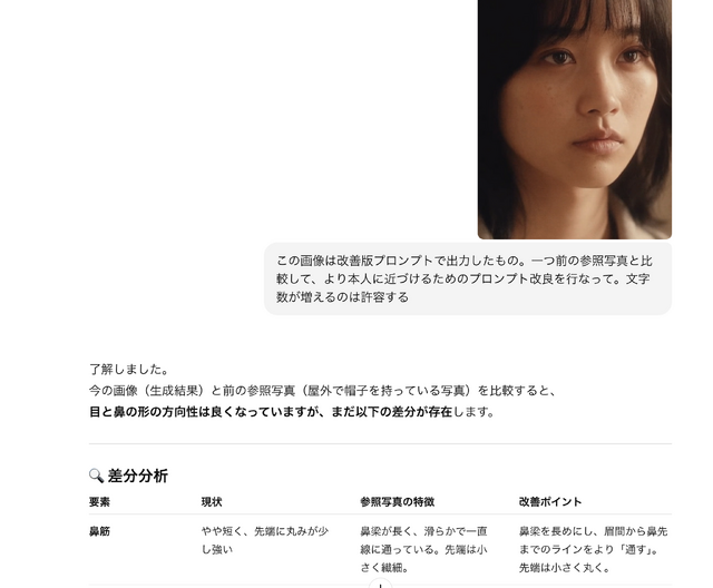 これでも本人に似てる感じにはならなかったので、生成された動画から静止画を切り出し、これと参照画像との差分を分析させました。