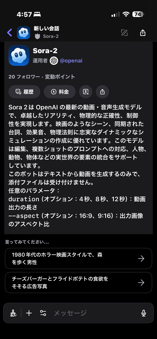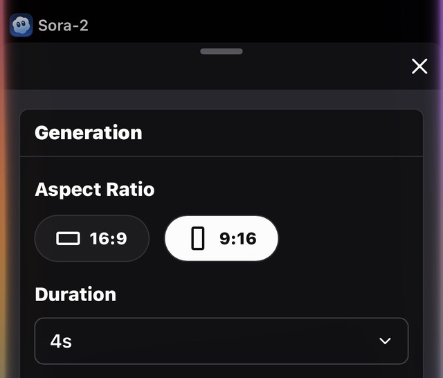 Sora 2 Proではアスペクト比で16:9と9:16だけでなく、7:4と4:7もサポートしています。長さは同じく4、8、12秒。長さだけでいうと、SoraアプリまたはサービスでProを使った方が長尺(15秒)が生成できることになります(ウォーターマークは入りますが)。