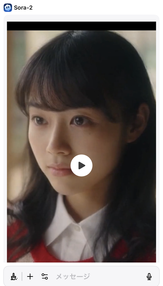 ChatGPTが提案してきたプロンプトを使い、Sora 2で出してみましたが、微妙に意図したものと違います。
