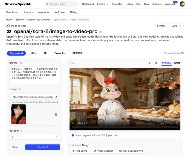 Poeでは画像の添付ができないので、WaveSpeedAIの方でも試しました。プロンプトと参照する画像添付をして実行を押すと……。