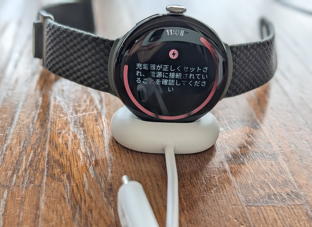 ちなみに、ホルダーが電源につながっていないまま本体をセットすると、こんなアラートが表示されます。旅先とかでうっかりしても安心です。充電中は時刻がこの向きのまま表示されます。