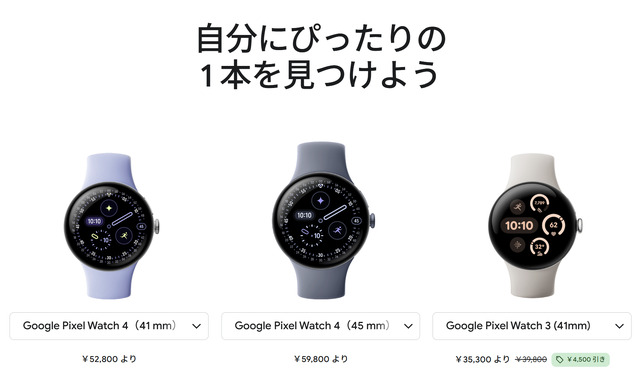 価格は、41mmが5万2800円から、45mmは5万9800円からと、先代から据え置き。また、Googleストアでは対象スマートウォッチの下取りで、例えばGoogle Pixel Watch 3の場合は最大2万5800円の払い戻しを受けられるキャンペーンを実施中です。41mmのWi-Fiモデルなら2万7000円になるということですね。