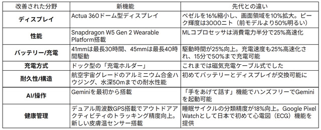 お値段据え置きながら、いろいろ改善されたり機能が追加されたりしています。Pixel Watch 4の主な特徴を表にまとめました。