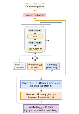 手法は、人間が難しい問題を解く時、一度答えを出してから見直し、修正を繰り返すのと同じように、TRMも最大16回まで自分の答えを改善していきます。各ステップで、前回の答えと推論過程を振り返りながら、より良い答えへと段階的に近づいていきます。