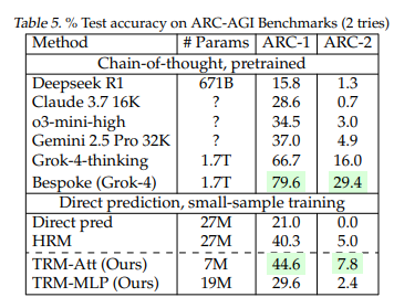実際の成果は、難しい数独で87%、複雑な迷路問題で85%の正解率を達成。人間には簡単でもAIには難しいとされる「ARC-AGI」テストでは約45%(HRMは約40%)の精度を記録し、さらに難解な「ARC-AGI-2」でも約8%(HRMは約5%)というスコアを記録し、Gemini 2.5 Pro 32KやClaude 3.7 16K、Deepseek R1といった巨大モデルを上回りました。