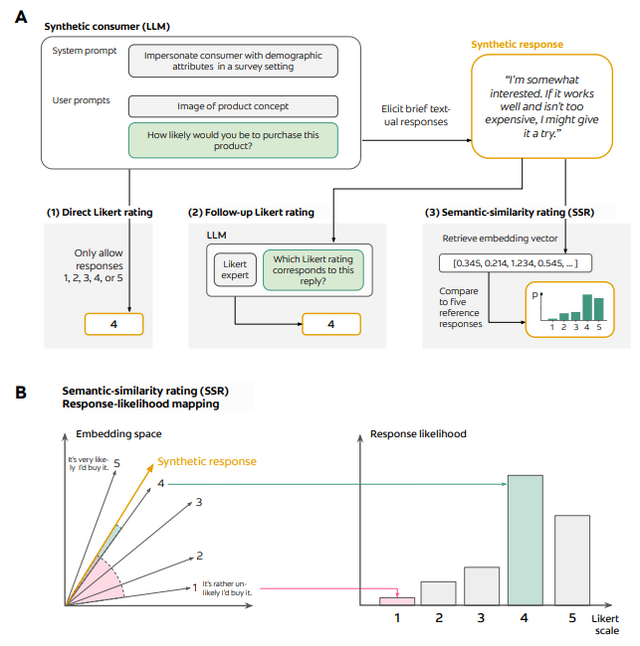 研究チームが開発した新手法では、LLMに数値(5段階評価など)ではなく自然な文章(自由文)で購買意向を表現させ、これらの文章を後から5段階評価に変換する仕組みを採用しています。これにより偏った回答を回避します。