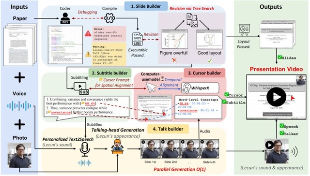 PaperTalkerは、LaTeXコードを使用してスライドを生成し、視覚的なレイアウトを最適化する新しい手法を導入しています。さらに、字幕とカーソルの位置を自動調整し、著者の声と顔写真から個人化された話者動画を生成します。スライドごとに並列処理を行うことで、生成速度を6倍以上高速化した点です。