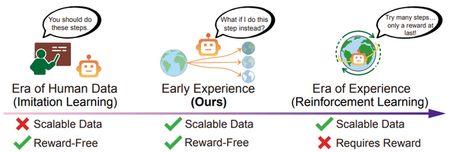 Early Experienceは、AIエージェントが自分で試行錯誤しながら学習する方法です。エージェントは様々な行動を試み、その結果として環境がどう変化するかを観察することで、報酬や評価がなくても自力で改善していきます。