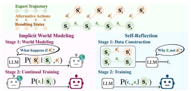 研究チームは2つの戦略を提案しています。1つ目は、色々試してエージェントが環境の仕組みを理解する「Implicit World Modeling」。2つ目は、自分の行動と専門家の行動を比較して、なぜ専門家の選択が良いのかを理解する「Self-Reflection」です。