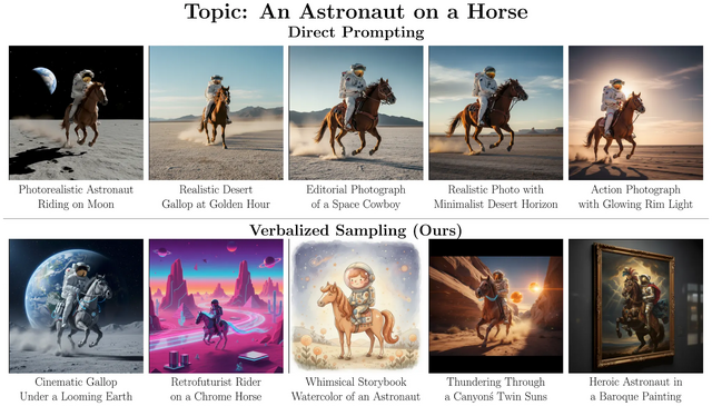 通常のプロンプトでは、司書に「最も人気のある本を1冊ください」と頼むようなもので、これだと毎回同じベストセラーが渡されます。一方、VSは「この図書館の全コレクション(ミステリー、SF、歴史などすべて)を考慮して代表する本を5冊、それぞれがコレクション全体のどれくらいを代表しているか(確率)と共に選んでください」と頼むようなもので、これにより、より多様な本が渡されます。