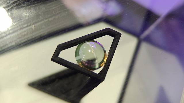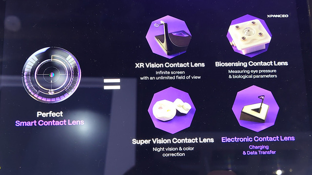 2025年10月にドバイで開催されたGITEX 2025の同社ブースでデモが行われていました。実際に目に乗せることはできず、治具に取り付けた状態での展示です。目の前に画面表示があるとどのように見えるのか、というイメージを見せるデモが行われていました。現時点ではコンタクトレンズは透明ではなく、中にディスプレイ表示層が見えます。