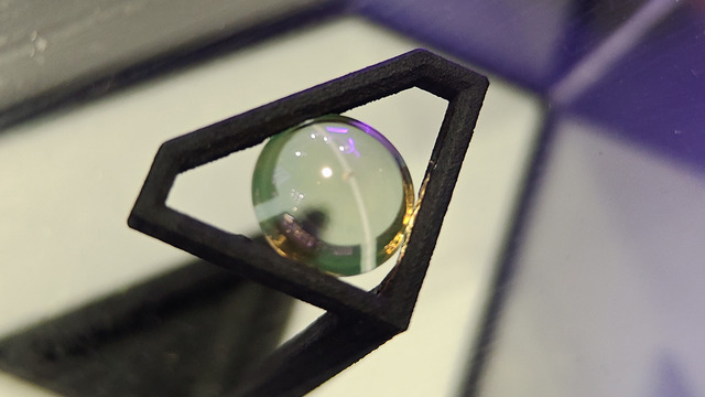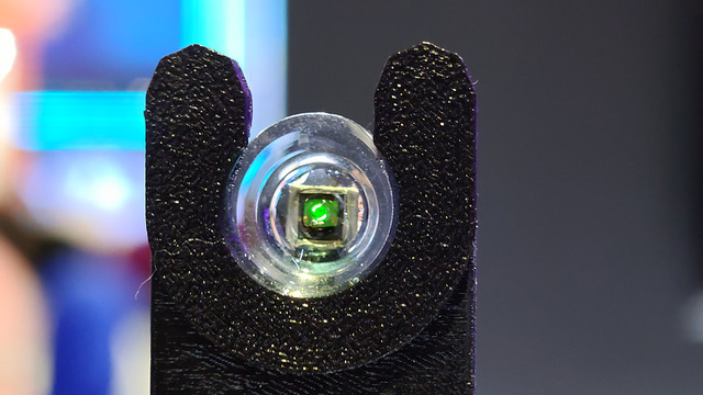センサーや表示に電力を使うため、どのようにバッテリーをコンタクトレンズ内に収めるかといった技術的な課題はありますが、ディスプレイ表示に関しては網膜に直接表示するため、スマートグラスのスカウターなどに比べると消費電力は微小とのこと。ディスプレイをどのようにレンズに内蔵するかですが、開発中のモデルでは直接、ディスプレイ表示層をレンズに貼り付けていました。