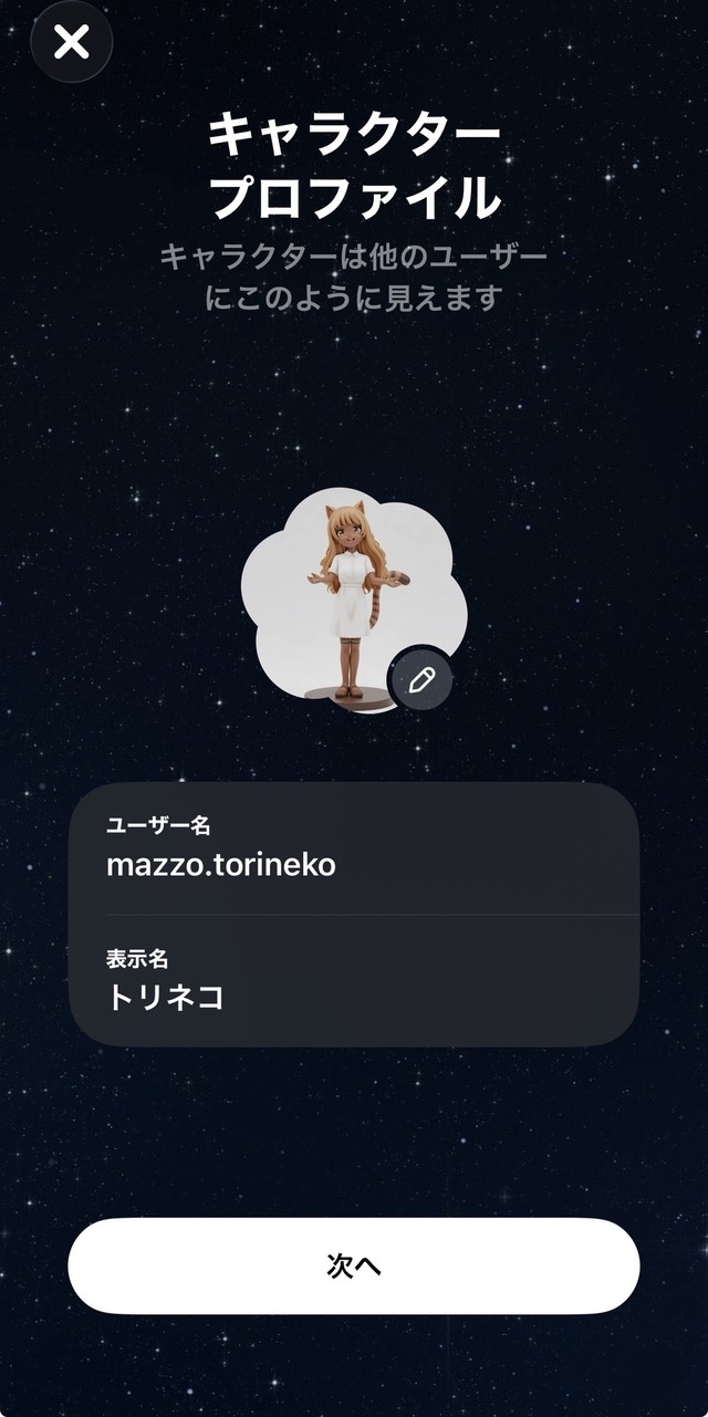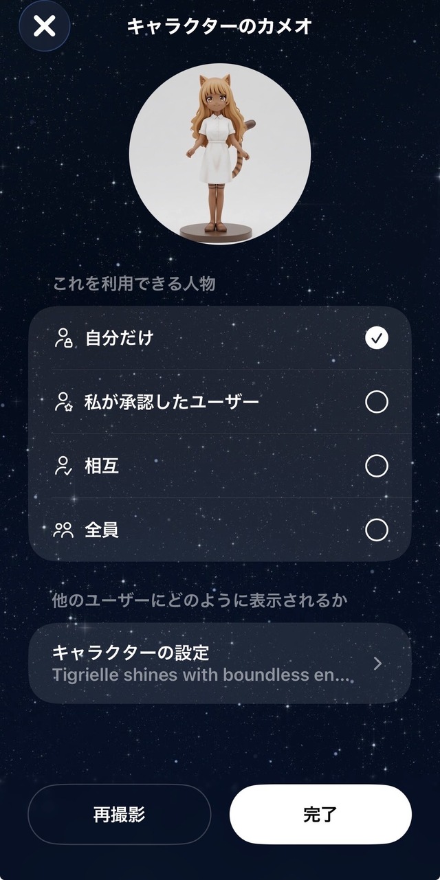 アップロードしたら、キャラクターの名前、説明、制約、そしてカメオを使える人物を指定して、登録完了です。