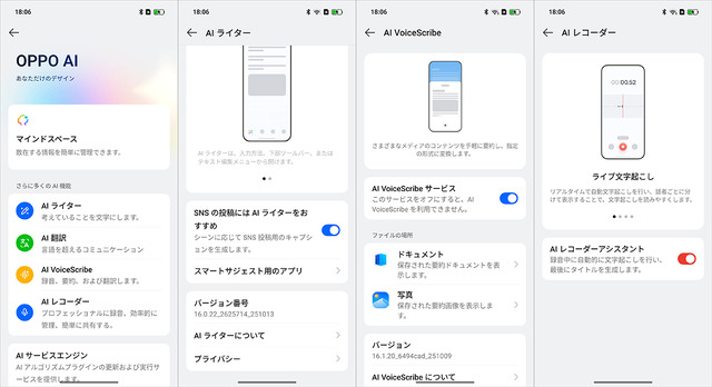 ほかにもAI機能としてはSNSの投稿文章を自動的に作ってくれる「AIライター」、コンテンツの情報をまとめ読み上げ模してくれる「AI ボイススクライブ」、リアルタイム文字お越しなどが可能な「AIレコーダー」などの機能も搭載。これらAI機能はFind X9シリーズが搭載するOPPOの新しいOS「ColorOS 16」で利用できるもの。過去のモデルに対しても2025年11月以降、順次アップデートが行われます。