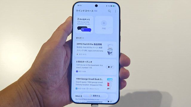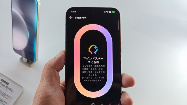 スナップキーはカメラの起動やマナーモード切り替え、ライトのONなどの操作が可能です。しかし、Find X9シリーズでは新たに「AI Mind Space」という機能が加わり、標準ではスナップキーから操作ができます。これはスナップキーを押すと画面のスクショを、長押しすると録音をAI Mind Spaceに保存します。スナップキーを2回押すとAI Mind Spaceが起動。