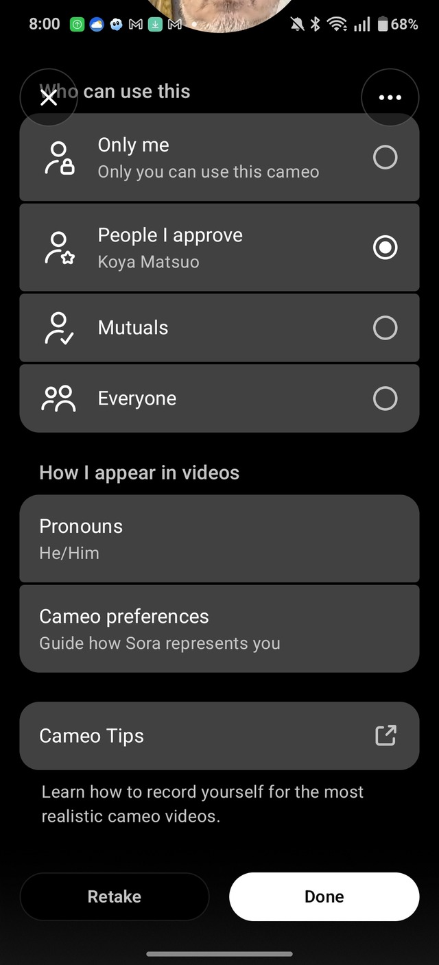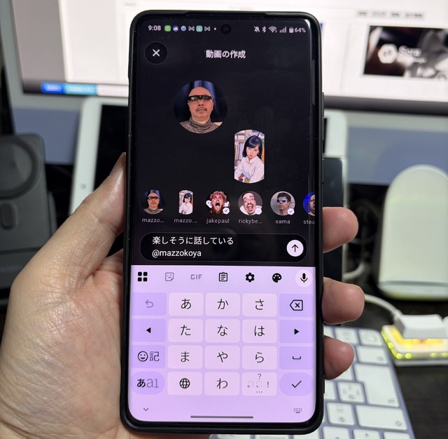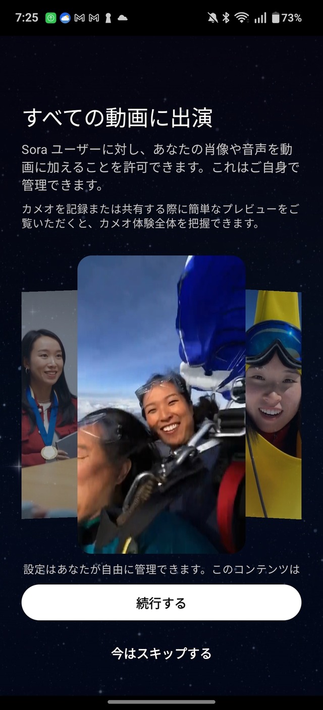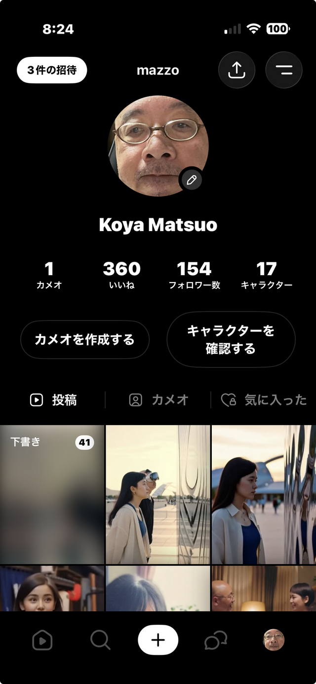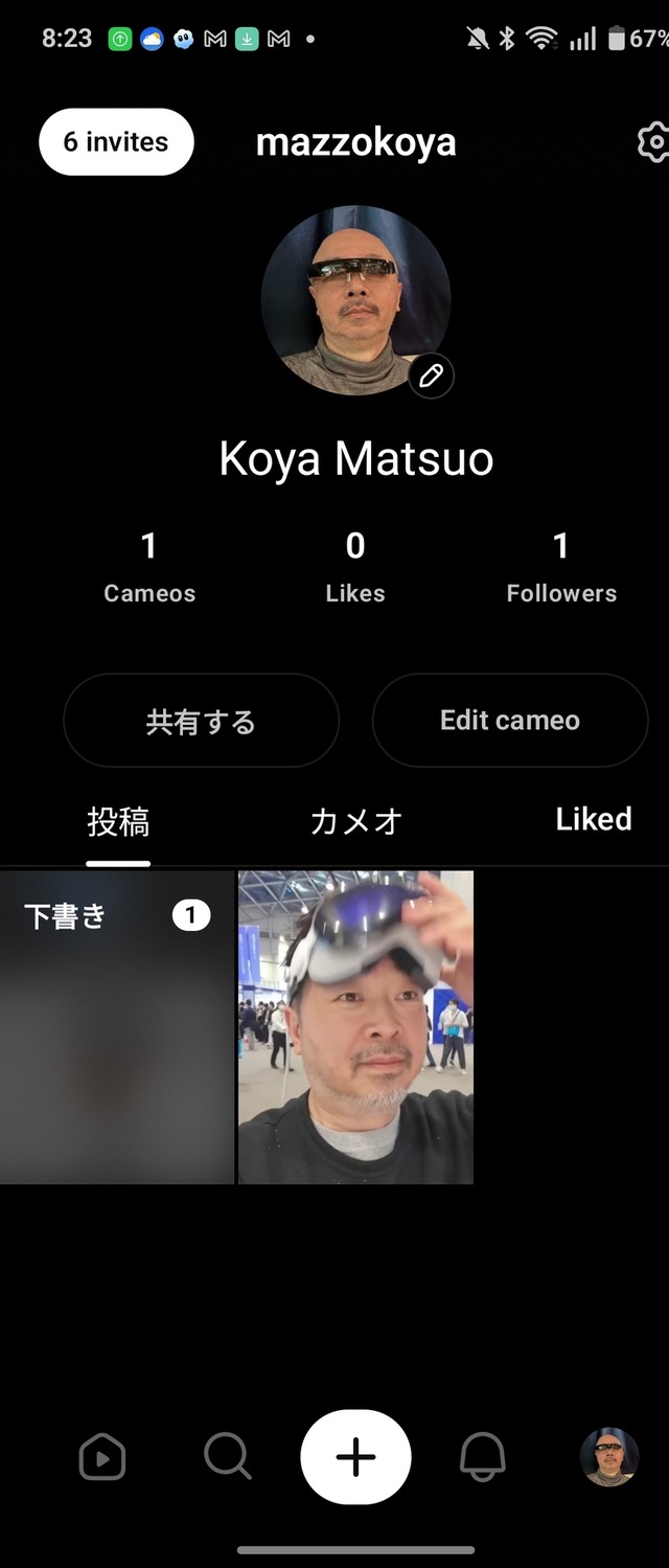 日本語がちゃんと通じるので、適当に入力します。「@koyamazzo が大阪万博で遊んでいる」「@koyamazzo が月面でギターを弾きながら歌っている」みたいなAI偽動画が簡単に、無料でできて、それを投稿できます。自分のカメオは姿だけでなく、声も自分そっくりのものになります。