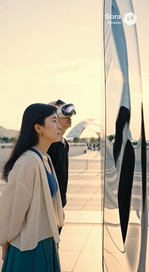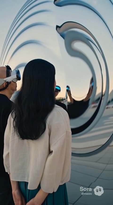 無料アカウントではキャラクターカメオの生成はできませんが、リミックスによる共演はできます。大阪万博落合館の鏡に、妻のキャラクター(つくば博のときの写真から生成)と、Vision Proを装着した自分が映り込んでいるという動画が生成できました。