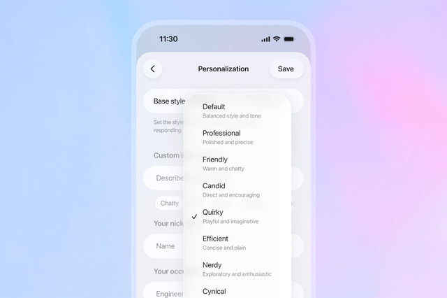 また、ChatGPTはGPT-5.1のサポートを追加するだけでなく、その応答の性格付けとしてこれまでのDefault、Friendly、Efficient、Professional、Candid、Quirkyといったオプションを用意し、既存のNerdyとCynicalも含めユーザーが自分に合ったものを選択できます。