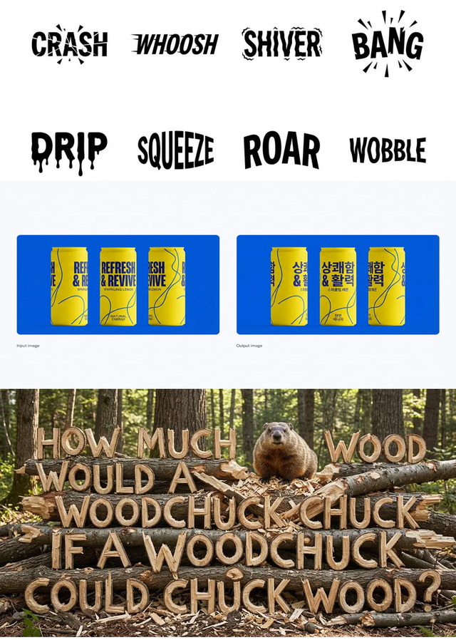 Googleが提示したサンプルでは、表記する単語の意味を反映したカリグラフィーを生成したり、商品の表面に記された商品名などを、イメージを損なわずに他の言語に正確に翻訳したり、プロンプトのフレーズを画像全体のシチュエーションになじむようアレンジしてレンダリングたりといった作例を確認できます。