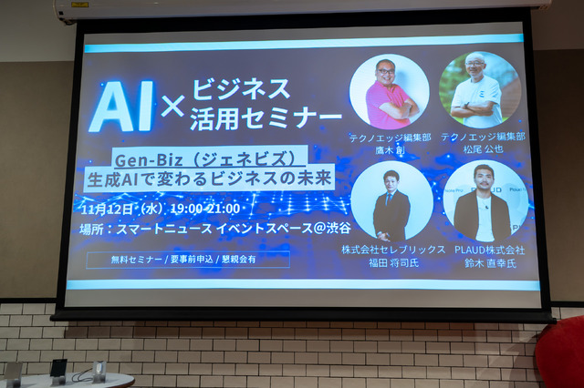 そこでテクノエッジ編集部では、生成AIをビジネス現場でどう活用し、定着させていくのか——その具体的な手法を紹介するセミナー「Gen-Biz(ジェネビズ)」を開催しました。登壇したのは、テクノエッジ編集部の松尾氏、営業支援のセレブリックスの福田氏、AIボイスレコーダーPLAUDの鈴木氏の3名。