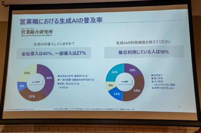 同社の調査では、営業職における生成AIの導入状況は、全社導入が40%、一部導入が27%に達していますが、生成AIを毎日使っている営業職は18%に留まっているとのことです。