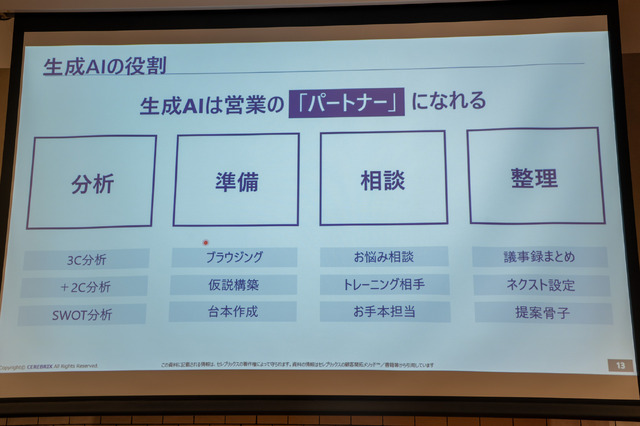 これらの壁を乗り越えるため、福田氏は生成AIを営業の「パートナー」として位置づけ、分析、準備、相談、整理という4つの領域での活用を提案。講演では、AIを相手に濃い仮説を立てる手法や、ロールプレイング相手としての活用方法が実演されました。