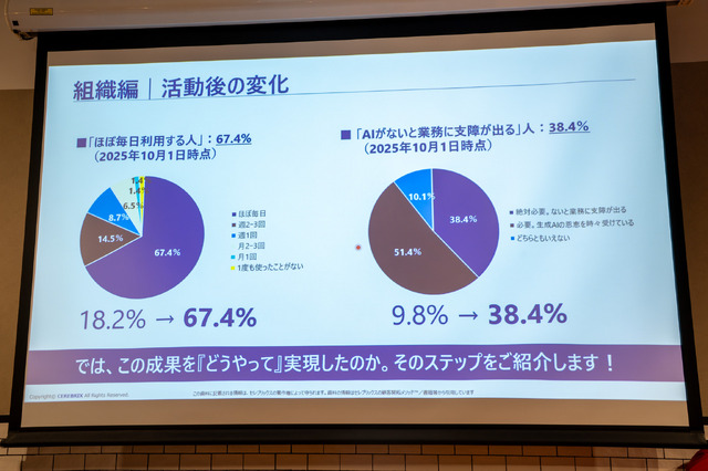 AI利用禁止のプロジェクトもある中で、営業代行事業の特定の部門では、「ほぼ毎日利用する人」を18.2%から67.4%へ、「AIがないと業務に支障が出る」人を9.8%から38.4%へとそれぞれ1年間で劇的に向上させました。