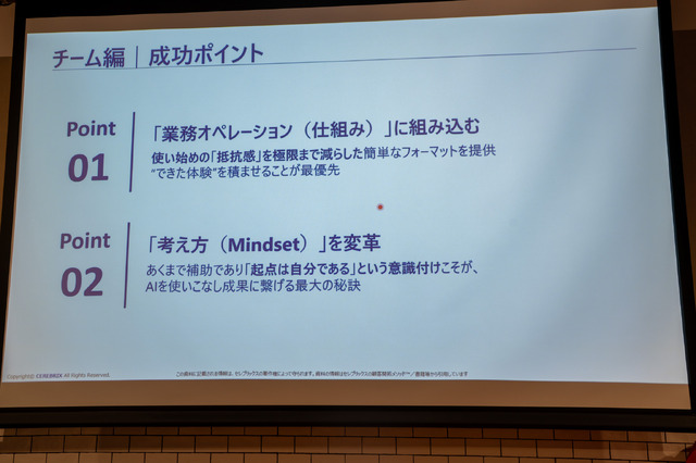 AI活用の壁を乗り越えた成功のポイントは、「業務オペレーション(仕組み)に組み込む」ことと、「AIに考えてもらう」のではなく「自分が考える補助としてAIを使う」というマインドセット変革だといいます。