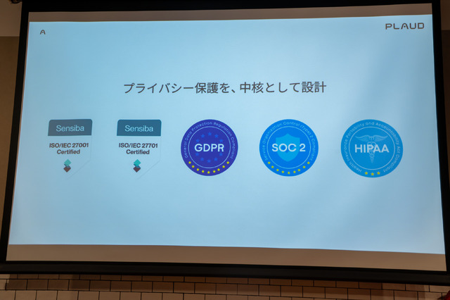 また、録音した情報を扱うということで、セキュリティについても重要視しているとのことで、ISO 27001&27001認証やGDPR、SOC 2、HIPAAなど様々な認証を取得しています。