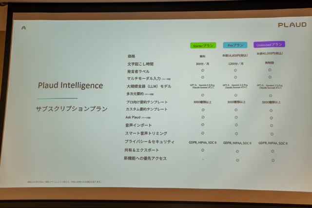 Plaud Note、NotePin、Note Proを購入すると、月300分まで文字起こしが可能なStarterプランを無料で利用可能。なお、録音自体は何時間でも可能です。