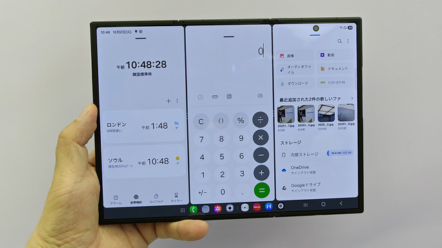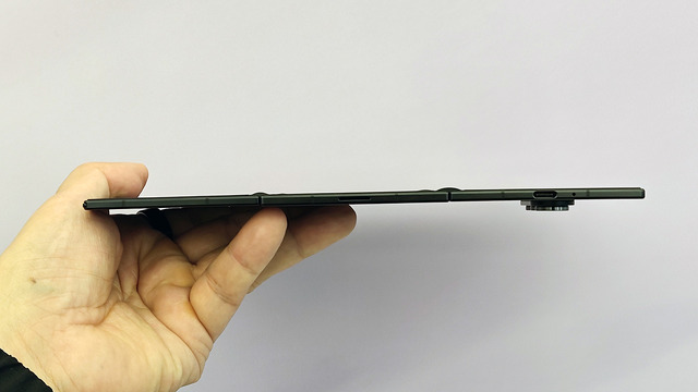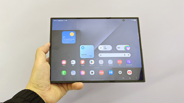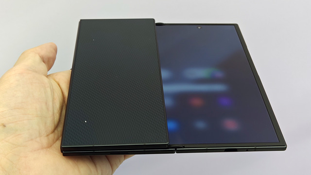 閉じたときのサイズは159.2×75.0×12.9mmで、Galaxy Z Fold7より若干長く、横幅も広めです。厚みが12.9mmありますが、思い起こしてみると初代の「Galaxy Fold」は15.5mm、また2024年の「Galaxy Z Fold6」12.1mmだったので、TriFoldはそれほど厚いということはないでしょう。
