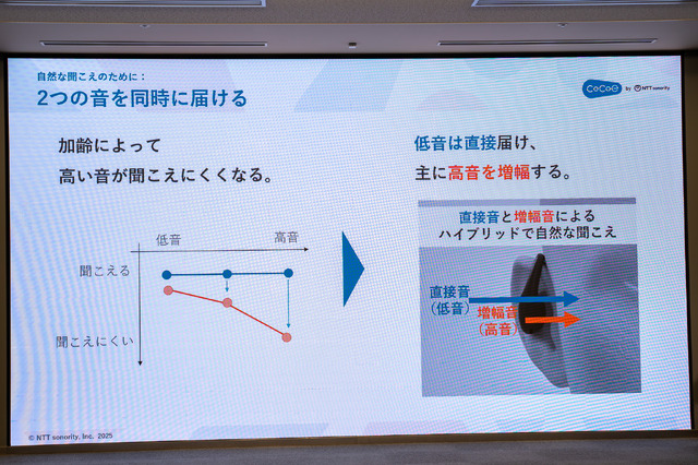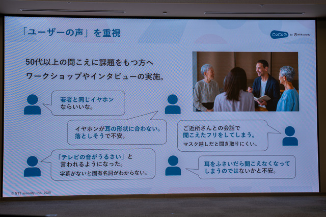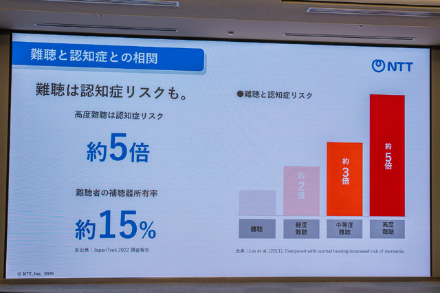 NTT常務取締役の大西氏は発表会で、「聞こえづらさは70代以上の問題ではなく、50代では10人に1人が難聴または難聴かもしれないと思っている。誰にでも訪れるライフステージの変化だ」と指摘。聞こえ方の課題が持つ社会的重要性を強調しました。