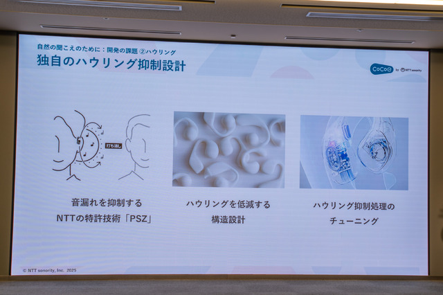 オープンイヤー型は構造上、音漏れやハウリングが発生しやすいという業界の定説があったとのこと。cocoe Earは、NTTの特許技術である音空間技術「PSZ(パーソナライズドサウンドゾーン)」を活用した音響設計を搭載。音の打ち消し距離を精密に制御することで、音漏れを抑制しながら、高性能チップとソフトウェアによるハウリング抑制機能と組み合わせることで、自然な聞こえと装着感を両立したとのことです。