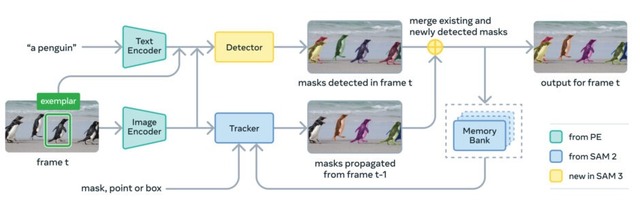 モデルのアーキテクチャは、画像レベルの検出器とメモリベースの動画トラッカーで構成されており、両者が単一のバックボーンを共有しています。特に「Presence Token」という仕組みを導入し、物体の認識と位置特定を分離することで、検出精度を向上させています。