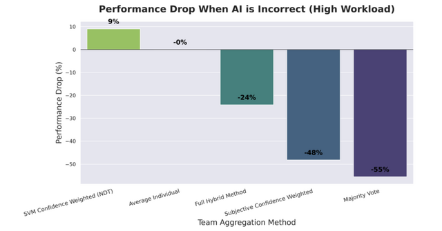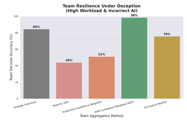 AIが嘘をつくと、多数決で決める従来型のチームは正答率が44%まで落ち込みました。チームが大きくなるほど全員が同じ誤りに引きずられ、集合知が逆に働いていました。ところが、参加者の脳波から抽出した神経信号だけを使って判断を決定するチームは、同じ条件下でも98%という正答率を維持しました。