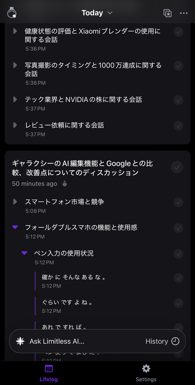 一方、Limitlessにはファイル転送の概念すらなく、ペンダントを身につけているだけでスマホアプリとウェブアプリに刻々と書き起こしが溜まり、AIが分析して話題ごとに分かりやすい見出しを付けてくれます。