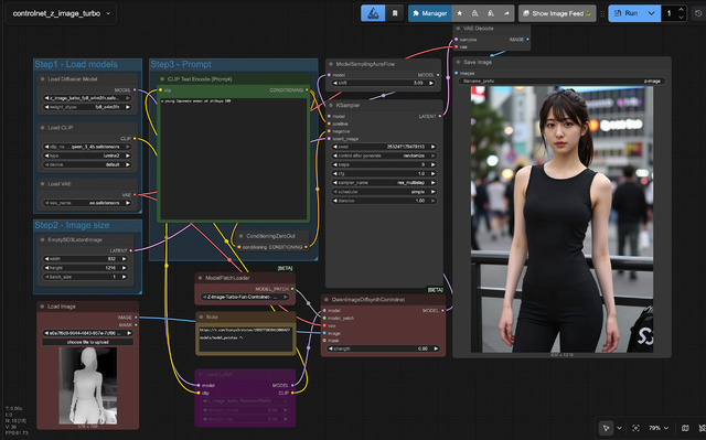 ControlNetのWorkflowは以下の通り。赤いノードが追加した部分となる。なお、ControlNetのモデルはmodels/model_patchesへ入れる必要がある。Unionタイプなのでモデル1つで、Pose、Depth、Canny、Hedなど複数の形式に対応する。
