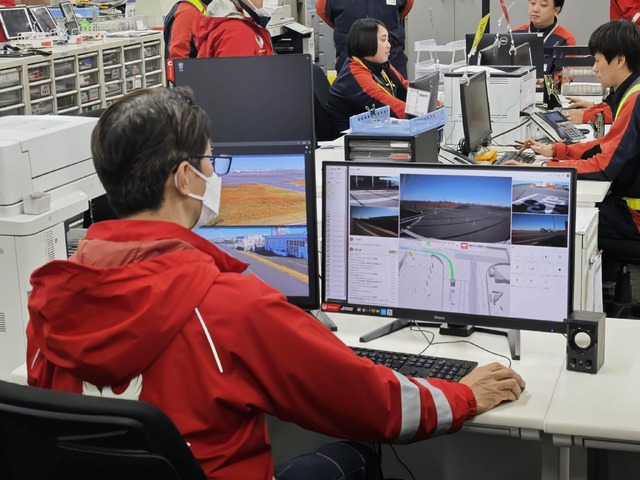 遠隔監視室では、複数のモニターを通じて車両のカメラ映像やシステムの状態を常時監視。車両は基本的には自律走行しますが、異常時や緊急時には遠隔監視者がシステムを通じて停止措置を行ったり、ワイパーやヘッドライトの操作を行ったりすることが可能です。また、貨物エリアでは、車両の運転から解放された作業員が貨物の連結や切り離し作業に専念することで、作業効率の向上が図られます。