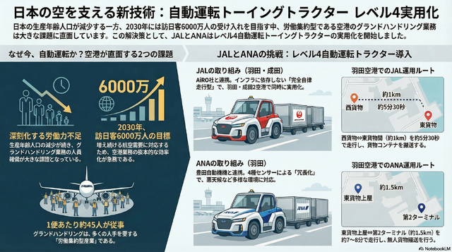 今回の技術導入の背景には、深刻化する生産年齢人口の減少と、回復・拡大する航空需要への対応があります。政府は2030年に訪日外国人旅行者数6000万人という目標を掲げているものの、空港のグランドハンドリング業務は労働集約型産業であり、人手不足が懸念されています。ANAとJALは、従来人手に頼っていた搬送業務にAIとロボティクス技術を導入することで、省人化と業務効率化、およびEV車両による環境負荷低減を目指しています。