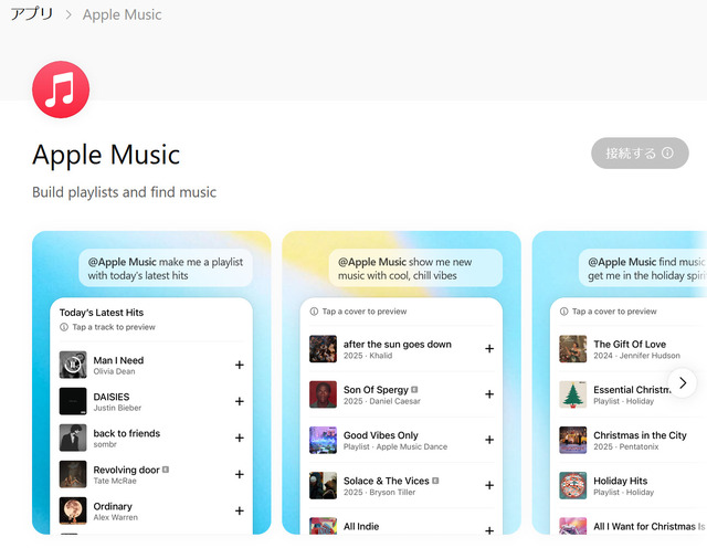 たとえばChatGPT内でApple Musicアプリを使えば、ChatGPTの機能を使って、あるアーティストの数十年前のライブのセットリストを調べ、それをもとにプレイリストを構築して再生するといったことが簡単にできます。