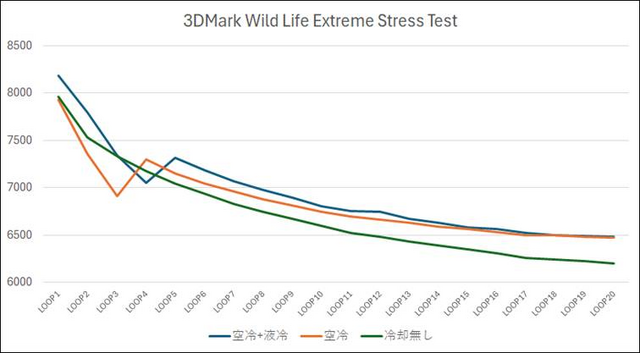 温度上昇に関しては、誤差の範囲と言っていいでしょう。スコアだけをみると、ほとんど差がなく、空冷+液冷と空冷では、最終的に6500程度に収束していきます。ただ、液冷システムを動作させていたほうが、スコアの落ち方は緩やかです。1~2時間連続でゲームをプレイする場合などには、体感できる差になるかもしれません。