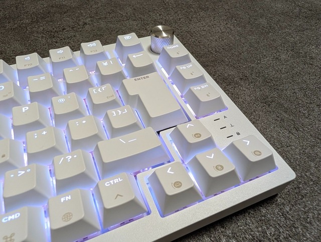 キーボード全体の仕様は、方向キーやFキー列を残しつつコンパクトな75%レイアウト、ゲーミングらしいRGBライティングはキーごとに設定可能、右上にはカスタマイズ可能なダイヤル。