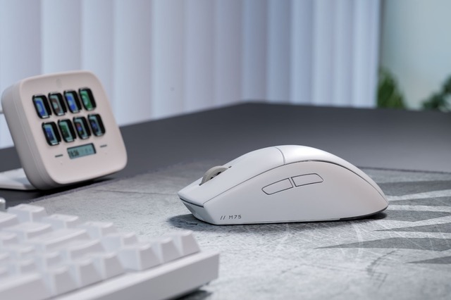 Corsair M75 Wireless は、K65 Plus Wirelessキーボードとペアで使いやすいゲーミングマウス。真っ白なFrost White に左右対称のすっきりしたスタイルで、最大26000DPIというゲーミングならではの高DPIセンサ Corsair Marksmanを採用します。
