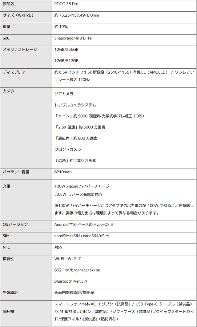 POCO F8 Proは、そのPOCO Fシリーズ最新世代の上位モデル。海外ではProより上のUltraが今世代から加わりましたが、国内向けにはF8 ProがPOCO最高峰になります。