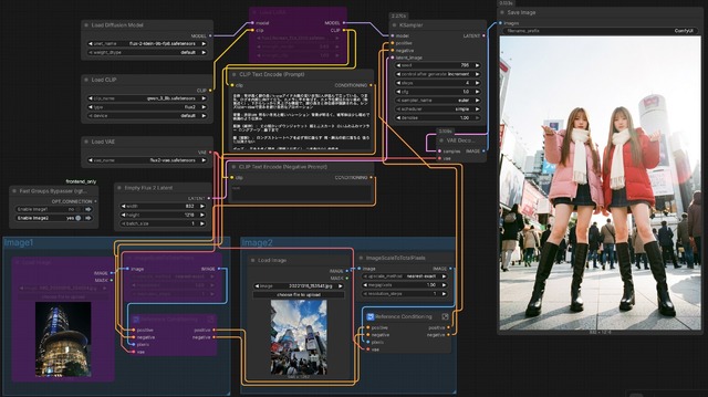 1つ目は実写と生成AI美女の融合。Promptで「渋谷109」と書いてもなかなかそれっぽい絵が出ないが、リファレンス画像を使えばらしいのがサクッと作れる。またPromptは全て日本語。Qwen3が8Bだからできる技だ。