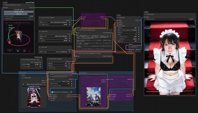 2つ目のWorkflowはQwen-Image-Editで話題になったUIで向き指定ができるWorkflow。UIを操作し希望の向きに設定、実行すると、それに相当するPromptが出力されるので、特殊なものでなく、編集系に応用可能。FLUX.2 [klein]で試したところうまくいった。